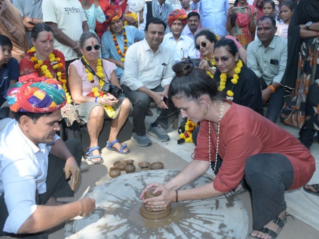 जैसे ही काफिला बूंदी की संकरी गलियों और हरे-भरे खेतों के बीच से गुज़रा, विदेशी मेहमानों ने अपने कैमरों में ग्रामीण जीवन के अनोखे दृश्य कैद किए। गांव पहुंचने पर ढोल-नगाड़ों और लोकगीतों के बीच उनका भव्य स्वागत किया गया। महोत्सव समिति सदस्य राजकुमार दाधीच ने बताया कि ठीकरदा गांव की महिलाओं ने सैलानियों को मांडणा बनाने, चाक पर मिट्टी के बर्तन गढ़ने और आंगन लीपने की कला सिखाई। विदेशी मेहमानों ने भी पूरे उत्साह से मिट्टी में हाथ आजमाया।
