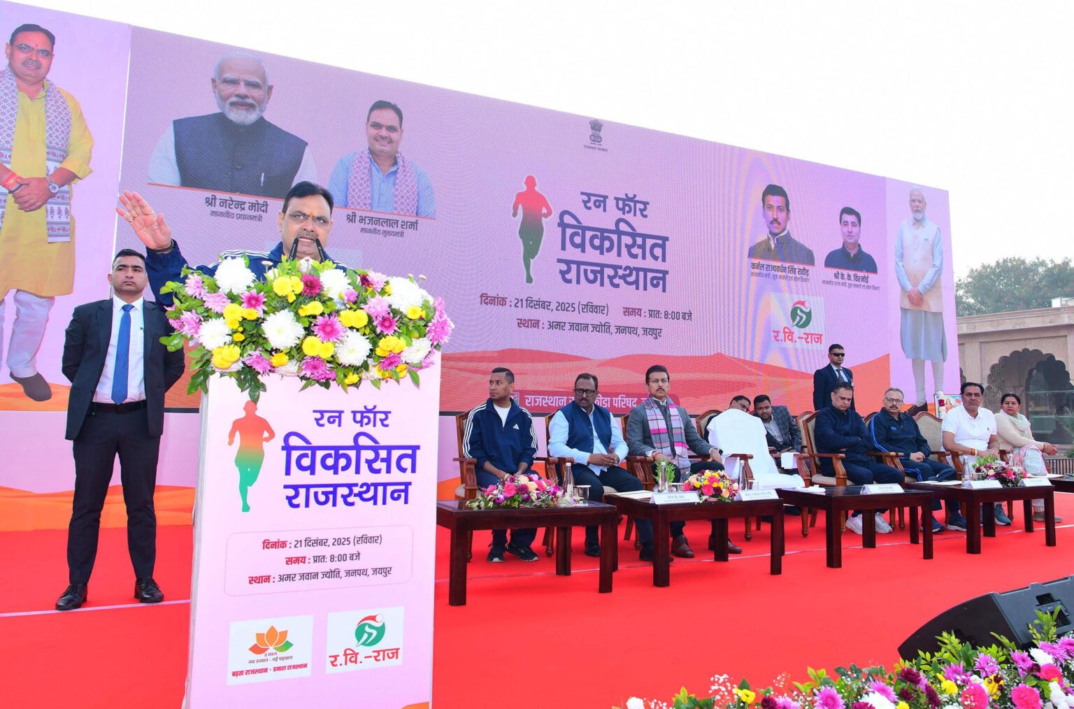 मुख्यमंत्री भजनलाल शर्मा राज्य सरकार के दो वर्ष पूर्ण होने के उपलक्ष्य पर आयोजित हो रहे कार्यक्रमों की श्रृंखला में रविवार को ‘रन फॉर विकसित राजस्थान’ कार्यक्रम को संबोधित कर रहे थे। इस अवसर पर उन्होंने अमर जवान ज्योति से ‘रन फॉर विकसित राजस्थान’ को हरी झंडी दिखाकर रवाना किया। उन्होंने कहा कि गत सरकार के समय युवाओं के सपनों को रौंदते हुए पेपरलीक के अनेक प्रकरण हुए थे जबकि हमारी सरकार के कार्यकाल में 296 भर्ती परीक्षाएं आयोजित की गई, उनमें से एक भी पेपरलीक नहीं हुआ है। हमारा लक्ष्य है कि युवाओं को पांच साल में चार लाख सरकारी नौकरियां दी जाएं। इसी क्रम में राज्य सरकार ने दो वर्ष के कार्यकाल में अब तक 92 हजार से अधिक नियुक्तियां प्रदान की हैं तथा 1.53 लाख पदों पर भर्ती प्रक्रियाधीन है। साथ ही, इस माह भी लगभग 20 हजार पदों पर युवाओं को नियुक्ति पत्र दिए जाएंगे। उन्होंने कहा कि राइजिंग राजस्थान ग्लोबल इन्वेस्टमेंट समिट के तहत हुए 35 लाख करोड़ रुपये के एमओयू में से 8 लाख करोड़ रुपये की ग्राउंड ब्रेकिंग की जा चुकी है। राज्य सरकार युवाओं को कौशल प्रशिक्षण दे रही है, जिससे वे अब रोजगार प्रदाता भी बन रहे हैं।