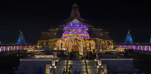 राम मंदिर के ध्वजारोहण समारोह से पहले राम नगरी अयोध्या शनिवार की रात आस्था और रोशनी से नहाई दिखाई दी। रात 9 बजे हुए भव्य लेजर शो से पूरा मंदिर परिसर जगमगा उठा। श्रीराम जन्मभूमि मंदिर के शिखर से आसमान की ओर जाती रंग-बिरंगी किरणों ने ऐसा दृश्य बनाया कि हजारों भक्त मंत्रमुग्ध होकर देखते रह गए।