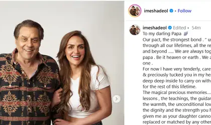 धर्मेंद्र की 90वीं बर्थ एनिवर्सरी पर ईशा का इमोशनल पोस्ट:लिखा- चाहे स्वर्ग हो या धरती हम एक हैं, आपकी सीख जीवनभर साथ रहेंगी